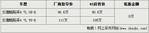 據經銷商銷售人員介紹,豐田-蘭德酷路澤分為4.0L和4.7L兩種排量,由于4.0L車型的尾氣排放是歐III標準,沒有達到北京施行的歐IV標準,所以北京限賣,店內沒有4.0L車型。4.7L車型分為GX-R版和VX-R版,目前購買蘭德酷路澤的消費者可以得到6萬元的優惠。經優惠后,GX-R版售價降為了90.6萬元,VX-R版售價降到了105萬元。銷售人員還介紹,店內沒有蘭德酷路澤現車,預購買者需交訂金1萬元,約等一個半月可提車。