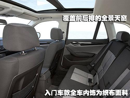 已經出現在現款X3身上的全景大天窗同樣也會出現在BMW X1配置中,在同級別車型中并不多見的差尺寸天窗一定會受到不少潛在車主的喜愛。
