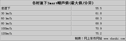 也許有人會擔心smart這么小的車隔音和密封性是否有問題,為此我們在北京北四環路中關村附近進行了測試,在車外我們測得了最高77分貝的環境噪聲;而當我們進入到車內噪聲指數立即下降了22分貝之多,55分貝的水平幾乎達到了辦公室的安靜程度。