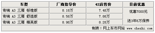 據4S店銷售人員介紹:目前奇瑞A3 1.6升三廂現車充足,顏色齊全,銀色、白色等車型可供挑選。目前A3可優惠7000元現金,并送3年6萬公里保養,這不僅可以在買車的時候得到一定的優惠,而且在今后養車方面也為消費者省下一筆不少的開支。