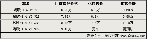 據4S店銷售人員介紹,目前銳歐全系優惠幅度并不大,現售主要是1.4L排量車型,由于賽拉圖兩廂和三廂完全能夠滿足消費者的購車需要,所以幾乎沒有消費者選購1.6L排量的銳歐。1.4L三款車優惠價格從0.68萬元到1.18萬元不等,同時店內有銀色、紅色等現車可供選購,現車顏色較為齊全,消費者選擇的空間比較大。