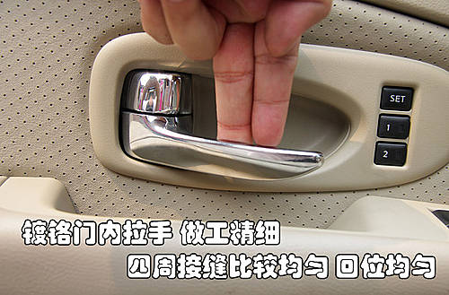 車門內(nèi)側(cè)拉手采用鍍鉻設(shè)計,金屬感比較強烈。雖然拉手周圍由塑料制成,但是拉手周圍的做工都很精細(xì)。