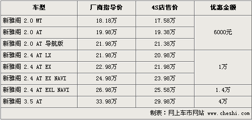 據(jù)4S店銷售人員介紹,目前購(gòu)買新雅閣各款車優(yōu)惠金額有差別。2.0排量車型購(gòu)車可優(yōu)惠現(xiàn)金6000元,優(yōu)惠完車價(jià)最低為17.58萬,但這款現(xiàn)車不多,2.0自動(dòng)檔兩款有黑色、銀色等供應(yīng)。除此之外,2.4排量三款車優(yōu)惠現(xiàn)金1萬元,高配則能給出1.4萬優(yōu)惠,3.5排量仍然現(xiàn)車緊張,需要預(yù)訂。訂車后仍能享受優(yōu)惠,最高優(yōu)惠4萬元。