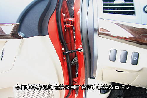 車門比同級別的日系車要沉些,感覺內在設計和扎實。此外,車門和車身之間連接采用了合頁和鉸接雙重模式。