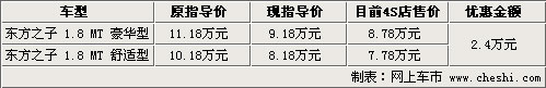 奇瑞東方之子在國內自主B級車中頗有盛名,暢銷六年以來,已經逐漸成為國人的信任和驕傲。東方之子自從今年5月份官方降價2萬以來,北京市場反響積極。在此基礎之上,目前在北京市場購買東方之子現車,還可以得到4000元的現金優惠。具體優惠車型見下表: