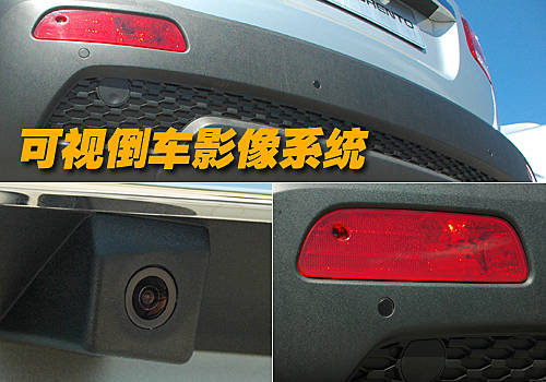 全新索蘭托頂配車型配備了倒車影像,在尾部鍍鉻裝飾條下方安置了一個倒車攝像頭,變速器掛入倒檔時內后視鏡顯示后方圖像。同時尾燈和高位剎車燈均由LED燈組組合而成。