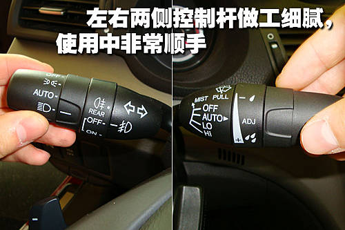 方向盤左右兩側(cè)控制桿為軟橡膠包裹手感細膩,無論是看、觸都能感覺到這部分材料的工藝質(zhì)量很好。并且旋鈕設(shè)計能夠滿足手指粗大駕駛者的使用及調(diào)節(jié)。