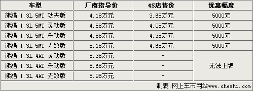 據吉利汽車4S店銷售人員介紹,熊貓1.3L手動擋車型目前都有現車銷售,而自動擋雖然已經上市,但由于北京地區無法上牌,所以還沒有現車抵達北京市場,預計最早會在今年年底前解決無法上牌的問題。目前熊貓1.3L手動擋全系可以優惠五千元,而這款車型還增加了電動升級后窗,需要在原價的基礎上加1000元。