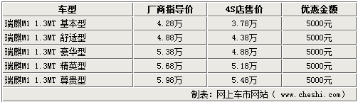 作為奇瑞瑞麒品牌的首款車型,瑞麒M1在正式上市后即吸引了眾多年輕消費者的關注。首批推出的瑞麒M1 1.3L車型的價格區間從4.28-5.98萬元,而即將入市的1.0L車型也可在預訂后享受相應的優惠。網上車市網站了解到,近期北京地區瑞麒4S店開始促銷M1,全系車型現金優惠5000元。
