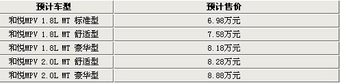依照江淮汽車的定價(jià)規(guī)則,和悅MPV很有可能采用同悅的定價(jià)特點(diǎn),預(yù)計(jì)會推出1.8L、2.0L兩個(gè)排量共計(jì)五款車型。另外,和悅MPV的入門級車型很有可能會定下較低的價(jià)格,使該系列產(chǎn)品擁有一個(gè)低價(jià)的宣傳策略,往往這種入門級低配車型很難銷售,或者是根本無車銷售。從同悅的配置價(jià)格差異來看,和悅MPV的價(jià)格區(qū)間應(yīng)該會定在6.98-8.88萬元左右。除了6.98萬元的入門級車型,和悅MPV同排量的舒適型和豪華型價(jià)格相差6000元左右,而同配置不同排量的兩款車的價(jià)格差應(yīng)該在7000元左右。