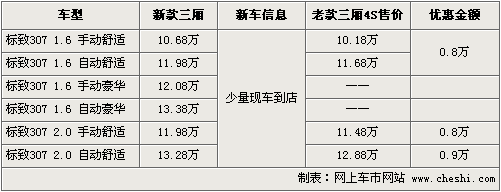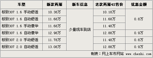 據東風標致北京地區4S店銷售人員介紹,目前還有少量老款307車型在售,優惠幅度較大,手動檔車型還贈送加油卡,現在購買比較劃算。新款307車型少量現車已到店,但車型及顏色還不齊全,預訂要交定金3千元,提車等1個月,而且暫無任何優惠。如想購買新款車型的朋友不妨等一陣時間,新款307大批量現車會陸續到店。