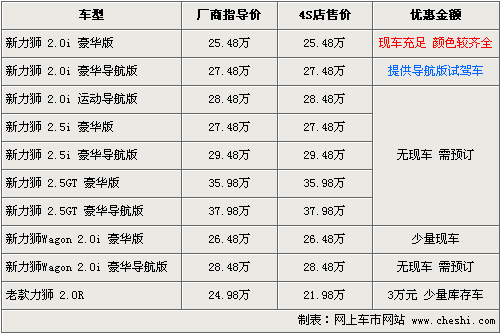 據斯巴魯北京地區4S店銷售人員介紹:新款力獅已經到店,目前全部為2.0i豪華版及Wagon豪華版,2.0i現車比較充足,顏色有藍色、白色、銀色、黑色、灰色可選。另外還提供了2.0i導航版為試駕車,而老款力獅還有少量庫存車,現優惠3萬元。