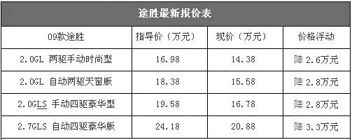 09款途勝上市后銷量一直都不錯(cuò),8月份售出了4331輛,在國(guó)內(nèi)SUV銷量榜中排在第五位,比同價(jià)位競(jìng)爭(zhēng)對(duì)手獅跑和逍客高出不少。昨日,我們從北京地區(qū)的一家北京現(xiàn)代汽車綜合經(jīng)銷商處了解到,近期09款途勝的價(jià)格已經(jīng)趨于穩(wěn)定,最高可優(yōu)惠3.3萬元。以下是09款途勝最新報(bào)價(jià)表: