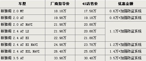 據(jù)廣州本田北京地區(qū)4S店銷售人員介紹,現(xiàn)購(gòu)買新雅閣均有6千-3.5萬(wàn)不等的優(yōu)惠,最低售價(jià)17.58萬(wàn),另贈(zèng)送“車行無(wú)憂”加強(qiáng)防盜系統(tǒng),例如您的車被拖走也會(huì)第一時(shí)間知道。3.5AT頂級(jí)型目前現(xiàn)車較少,則需要預(yù)定。