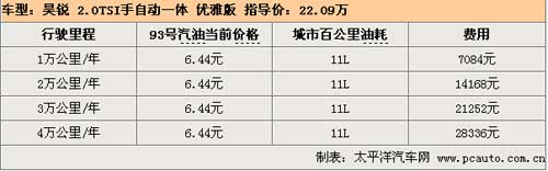 昊銳配備的2.0TSI發動機在轉速達到5100rpm時可以輸出147kw的最大功率,在1700rpm時可以產生280Nm的最大扭矩,動力性能更加強勁,無論在起步、加速、爬坡或是其他任何工況下,都可以讓駕駛者盡情地享受駕駛樂趣。根據網友實際油耗調查系統表示,昊銳2.0TSI百公里實際油耗為11L,行駛1萬公里需要花費7084元。