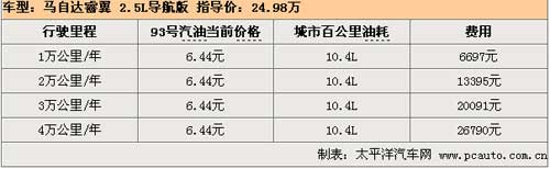 睿翼是我們對比的中高級車中油耗最低的一款車,城市百公里油耗僅為10.4L,對于一款2.5L排量的車型來說可謂十分出眾,而且馬自達廠商聲稱睿翼是可以使用93號汽油的而且不會對發動機造成影響,93號汽油比97號油每升便宜了0.41元!所以總體來說,假如車主每年行駛3萬公里的話,一年下來對比燃油費用最高的銳志可以節省近5000元。