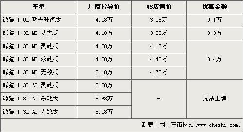 據吉利汽車4S店銷售人員介紹,吉利熊貓近期有最高4000元的優惠。新推出的1.0L車型優惠為1000元,售價降到了3.98萬元。1.3L手動功夫版優惠3000元,售價降到了3.88萬元,其他手動擋車型優惠4000元。由于熊貓1.3L自動檔車型尾氣排放不合格,所以無法在北京上牌照。銷售人員還介紹,目前1.0L車型較緊張,1.3L車型現車充足。