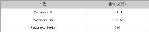2009年11月9日,保時(shí)捷以“至善者不息”為主題,在廈門舉行了全新Panamera的發(fā)布會(huì),并且宣布新車將于11月底于全國范圍內(nèi)各家保時(shí)捷中心到店。共發(fā)布了三款車型,分別為Panamera S、Panamera 4S和Panamera Turbo,詳細(xì)車型售價(jià)請見下表: