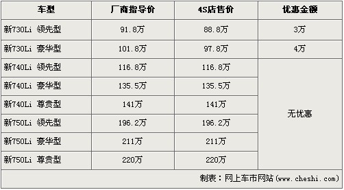 據北京寶馬經銷店銷售人員介紹,寶馬新7系共分為730Li、740Li、750Li三種等級車型,售價區間為91.8萬元-220萬元。目前購買新730Li領先型的消費者可以得到3萬元的優惠,新730Li豪華版車型可以優惠4萬元。消費者還介紹,除了新730Li有現車外,其余車型均需預訂,訂金是10萬元,最早12月份可提車。