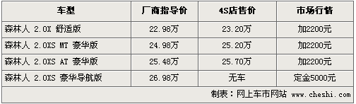 據斯巴魯4S店銷售人員介紹,目前森林人全系店內的實際銷售價格比原來指導價增加了2248元,主要原因是全系增加了倒車雷達以及尾喉配置。目前2.0XS自動導航版和2.5XS兩款車型均有現車供應,顏色主要為藍色、白色、紅色、黑色。部分顏色及車型還需要預訂,訂金為5000元,最快一個月可以提到車。另據介紹,2.0XS豪華導航版已停止生產。北京地區各4S店由于訂單不同,各店銷售的現車顏色有所不同。