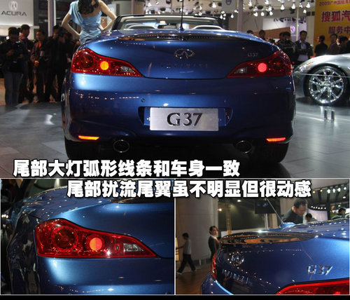 G37敞篷版的尾部大燈設(shè)計與前大燈交相呼應(yīng),同時尾部的小型擾流尾翼也為尾部增添了動感色彩。車身簡潔的線條個性很鮮明,流暢中蘊含著無限動能與速度感,讓人過目難忘。