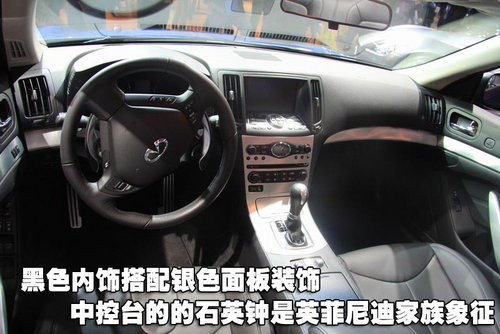 內(nèi)飾的風(fēng)格依然保持了英菲尼度家族式的風(fēng)格,中控臺中央的石英鐘無疑就是它典型的的家族特征。黑色內(nèi)飾搭配銀色面板裝飾,沉穩(wěn)中不失活力。