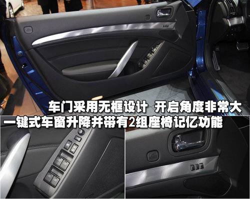 G37敞篷版采用了跑車流行的無框式設(shè)計,車門的開啟角度非常大,極大方便了上下車。同時駕駛門集合了一鍵式車窗升降以及電動后視鏡調(diào)節(jié)。并帶有兩組座椅記憶功能。
