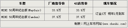 據(jù)北京經(jīng)銷店銷售人員介紹,MINI50周年分為Mayfair和Camden兩款車型,售價(jià)分別我餓哦33.9萬元和37.9萬元。目前店內(nèi)已經(jīng)可以接受MINI50周年紀(jì)念版車型的預(yù)訂,訂金為3萬元,最早一批現(xiàn)車將會在明年的2月份交到消費(fèi)者的手里。