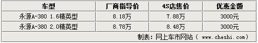 永源汽車旗下的A-380車型在經銷商處現可給出3000元的現金優惠。經銷商表示,現在店內的1.6L及2.0L車型均可滿足消費者購車的需要,顏色也比較齊全。