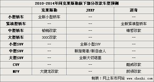 繼意大利汽車制造商菲亞特收購克萊斯勒后,在未來12至18個月內將進行較大的戰略調整,多款全新的車型規劃將陸續出臺。全新一代克萊斯勒300C轎車和和2011吉普大切諾基越野車首當其中,此外在未來18個月內還將有5款全新改款車型推出。