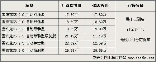 東風雪鐵龍4S店銷售人員介紹,C5目前已開始接受預訂,訂金為1萬元,目前陸續已有客戶開始訂車,最快12月份可以提到現車。C5的展車現已到店,對這款車感興趣的朋友不妨親身去體驗一下。東風雪鐵龍C5共有2.0L、2.3L和3.0L三種排量,四種級別可供選擇。