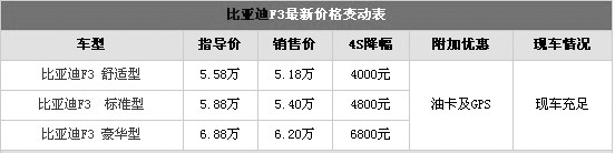筆者從滬上經銷商處了解到,比亞迪F3豪華版最高優惠6800元,而舒適型和標準型各優惠4000元和4800元。目前現車充足,到店即可提車,感興趣的朋友不妨到店詳談,可以爭取到更多的讓利。