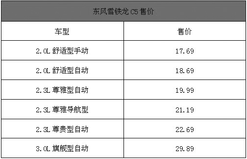 2009年11月23日,在第七屆中國(guó)國(guó)際汽車博覽會(huì)上,備受矚目的09年B級(jí)車市壓軸之作,東風(fēng)雪鐵龍品牌戰(zhàn)略旗艦車型C5正式公布價(jià)格。東風(fēng)雪鐵龍C5共有2.0L、2.3L和3.0L三種排量,四種級(jí)別可供選擇,其價(jià)格區(qū)間為17.69萬-29.89萬元。從即日起,全國(guó)各指定銷售網(wǎng)點(diǎn)開始接受預(yù)訂,首批展車也將陸續(xù)到店,并于2010年1月初正式交付。