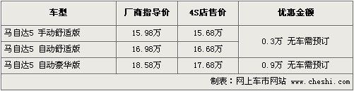 據一汽馬自達北京地區4S店銷售人員介紹:馬自達5的現車供應持續比較緊張,現購買頂配車型最高優惠現金9千元,低配車型優惠3千元。店內目前沒有現車供應,需要預訂,訂金為1萬元,最快等待15天左右可以提車。如消費者有意購買,到店詳談會有更優惠的價格。北京地區各4S店由于訂單不同,各店銷售的現車顏色有所不同。