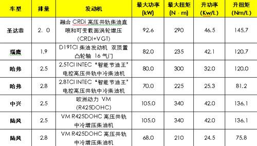 通過發動機的對比(上表),我們不難發現,在發動機的功率和扭矩方面中興和陸風略勝一籌,然而在真正反映發動機動力技術水平的指標——升功率上,排量較小的圣達菲2.0T則領先排名第二的瑞鷹10.5。
