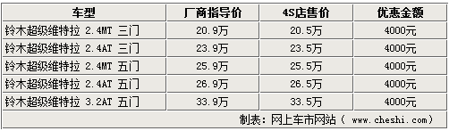 據記者走訪北京多家鈴木4s店了解到,目前店內銷售的新超級維特拉全系優惠4000元。低配的3門版2.4L 5速手動車型最低售價降為20.5萬元,而排量稍大采用5速自動變速器的5門版3.2L車型經優惠后售價也降為33.5萬元,是全系最高價。店內現車顏色方面,新超級維特拉有黑、灰等顏色供消費者選購,最低配的2.4L 3門手動版車型和3.2L 5門自動檔車型店內現車不全,欲購買的消費者需交2萬元訂金,約等半個月即可提車。