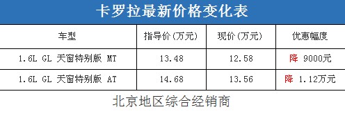近日,編輯從北京地區綜合經銷商處了解到,卡羅拉有1.6L特別版現車(銀色、黑色、紅色);目前購車的優惠幅度與09年末相比有了顯著提升,最高優惠1.12萬元,性價比還不錯。據經銷商透露,消費者要想以這個價格提車,需要在店內做一條龍服務,其中車輛保險的折扣需要消費者到店與銷售人員詳談才能夠確定。以下是卡羅拉最新價格變化表: