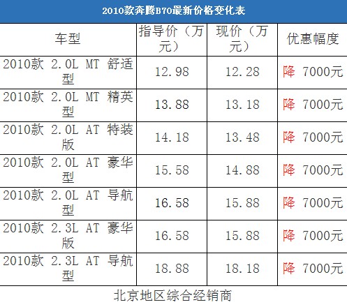 近日,編輯從北京地區綜合經銷商處了解到,奔騰B70有黑色、銀色和灰色現車,基本上可以滿足消費者的需求,如果購車需要預定,等待半個月左右就可以提車;目前購車全系有7000元的現金優惠。據經銷商透露,消費者要想以這個價格提車,需要在店內做一條龍服務,其中車輛四項基本保險可以打8.5折(約合4200-5500元左右)。以下是奔騰B70最新價格變化表: