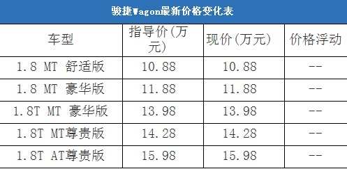 近日,編輯從華晨中華4S經銷商處了解到,駿捷Wagon有少量現車,部分車型需要預定,最多等待1個月就可以提車,定金為5000元。據經銷商透露,目前這款車沒有任何現金優惠,需要消費者到店內與銷售人員詳談才能爭取少量優惠。以下是駿捷Wagon最新價格變化表: