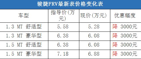 近日,編輯從北京地區綜合經銷商處了解到,近期駿捷FRV的現車比較充足,有黑色和銀色現車,基本上可以滿足消費者的需求。目前購車可以優惠3000元現金,并且贈送價值3000元的汽車裝飾禮包。據經銷商透露,消費者要想以這個價格提車,需要在店內做購車一條龍,其中車輛四項基本保險可以打8折(約合2500-2900元左右)。以下是駿捷FRV最新價格變化表: