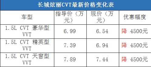 近日,編輯從北京地區(qū)綜合經(jīng)銷(xiāo)商處了解到,購(gòu)買(mǎi)長(zhǎng)城炫麗CVT車(chē)型有4500元的現(xiàn)金優(yōu)惠,店內(nèi)有黑色現(xiàn)車(chē)在售,部分車(chē)型預(yù)定等待10天左右就可以提車(chē)。據(jù)經(jīng)銷(xiāo)商透露,消費(fèi)者要想以這個(gè)價(jià)格提車(chē),需要在店內(nèi)做購(gòu)車(chē)一條龍服務(wù),其中車(chē)輛四項(xiàng)基本保險(xiǎn)可以打8折(約合2800-2900元左右)。以下是長(zhǎng)城炫麗CVT最新價(jià)格變化表:
