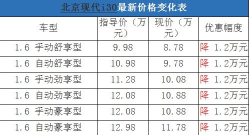近日,編輯從北京地區北京現代4S經銷商處了解到,現代i30有較為充足的現車銷售(紅色、銀色和灰色),可以滿足消費者在春節前夕的購車需求。目前在4S店中購車可獲贈價值1萬元的裝潢禮包,經銷商表示這個優惠可以折現,但具體金額需要消費者到店詳談才能確定。相比之下,現代i30在綜合經銷商處的優惠幅度更加可觀,1.6L車型可以優惠現金1.2萬元。以下是現代i30最新價格變化表: