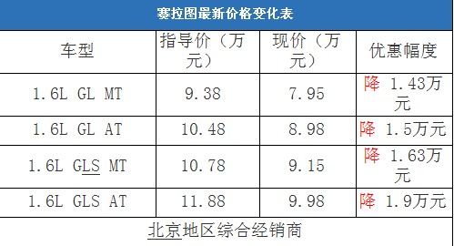 賽拉圖1.6GLS MT車型與1.6GL MT車型在配置方面增加了遙控鑰匙、電動天窗、倒車雷達、多功能顯示屏、真皮座椅、后視鏡加熱等,而1.4萬元的差價不如消費者自行選裝這些配置合適。1.6GL MT車型與1.6 GL AT車型在指導價上相差1.1萬元,除了變速箱有所區別其他配置完全相同,而對于該車并不很先進的4速自動變速箱而言這樣的差價沒有太大優勢。由以上兩點可以看出,消費者如果想要購買賽拉圖,那么最低配的1.6L GL MT車型顯然是性價比最高的選擇。