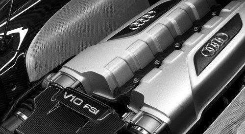 采用干式油底盒的5.2L FSI V10發動機采用了碳纖維頂罩,發動機艙同樣使用了玻璃外殼,這樣就可以大方的像外人炫耀。另外,V10發動機相比只比V8發動機重了31千克,爆發點也略微靠后,V8發動機在7800轉/分時獲得最大功率414馬力,而V10發動機在8000轉/分時能夠獲得518馬力。此外,V8版的R8在6000轉/分時獲得最大425Nm的扭矩,V10發動機能夠在6500轉/分時輸出最大530Nm的扭矩。