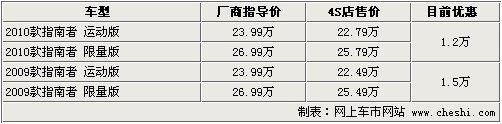 據4S店銷售人員介紹:指南者目前共有2009款及2010款車型,分別為運動版及限量版總共4款。09款車型現車顏色為黑色及綠色,全系優惠1.5萬元;2010款車型有黑色、綠色、紅色,最高優惠1.2萬元。目前老款及新款優惠價格相對較高,如果到店洽談會有簡單裝飾贈送。09款指南者優惠后最低僅售22.49萬元,凸顯性價比。