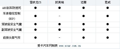 車型的安全性配置是購買者非常關注的一個因素,我們為大家選取了五種較為常見的主被動安全配置進行比較。