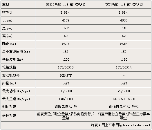 3月22日,動感都市家轎――風云2兩廂 “鯨”艷登場,此次上市的風云2兩廂,實力型,售價5.18萬元;進取型,售價5.58萬元,豪華型,售價5.88萬元,尊貴型,售價6.08萬元,共有魅力橙、炫金黃、靈動灰、閃電銀、活力藍、激情紅等六種顏色。那么這款小車的競爭如何呢?我們選擇與豪華價位接近的悅翔兩廂手動豪華型,來看看風云2到底怎樣,希望能為您購車提供參考。