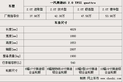 國產奧迪Q5在輪轂的搭配方面做的比較講究,每款車型配備的輪轂都不一樣,單看輪轂就可以區分出4款車型的配置,頂配版的豪華型更是選擇了19寸的超大輪轂。