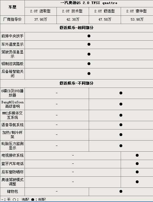 往往全系車輛的價格差異差的最多的就是在豪華娛樂配飾上面,奧迪Q5當然也不例外。奧迪Q5舒適型以及豪華型配備了奧迪的第三代MMI多媒體交互系統,通過精簡控制器,MMI可以迅速、方便、直觀地使用大量的功能和技術。播放器選用了帶有DVD功能的6碟CD系統,而音響也是選用了丹麥的頂級音響品牌Bang&Olufsen,綜上幾個配置,都是在進取型以及技術型上看不到的配置。頂配的豪華版車型,相比其他3款車型則多了電視接收系統、藍牙汽車電話等高科技味道十足的娛樂設備,而可以調節減震阻尼軟硬的奧迪駕駛模式系統,也是只在頂配的豪華版車型上共享的。