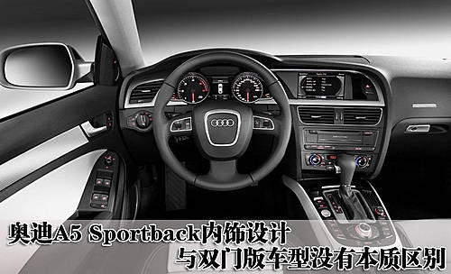 奧迪A5 Sportback四門轎跑車擁有與奧迪A系家族車型一致的內飾設計,最大的區別在于車廂布局上。銀白色的金屬裝飾條和黑色防反光儀表板,突出時尚與動感的視覺效果,甚至在車頂和座椅的色彩選擇上都采用了冷酷的黑色。
